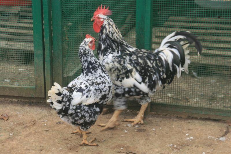 É uma subespécie da galinha doméstica reconhecida pela sua plumagem manchadinha de branco e preto.