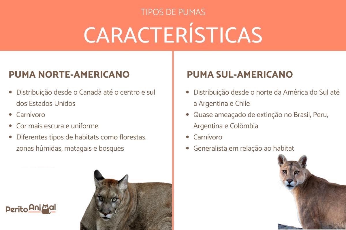 Com base no referido estudo, os peritos da UICN reconhecem atualmente dois tipos de puma: o puma norte-americano (Puma concolor couguar) e o puma sul-americano (Puma concolor concolor). A seguir estão alguns aspectos de cada um deles.