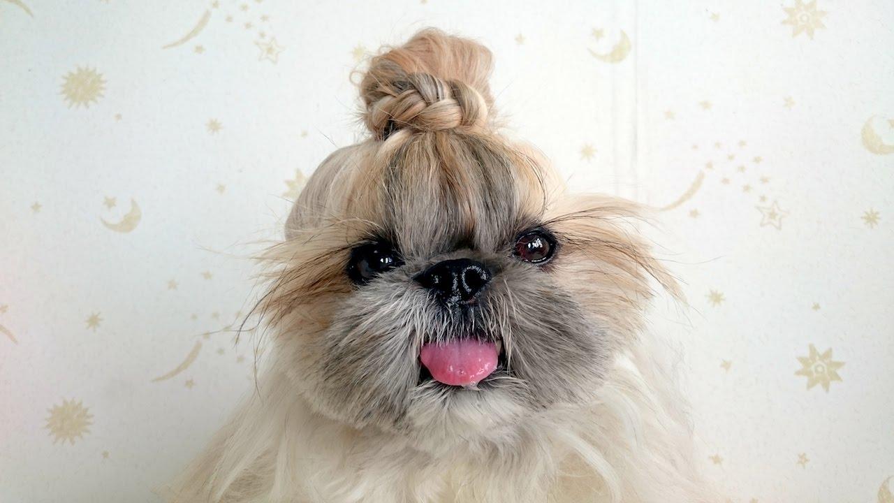 Para fazer este penteado, pegue o pelo da coroa do cachorro e escove suavemente para cima, removendo os nós e dando volume ao mesmo tempo. Prenda a mecha com um elástico para o cabelo, de preferência de látex. Arrume as laterais da cabeça e pronto, o seu shih tzu tem um novo coque perfeito!