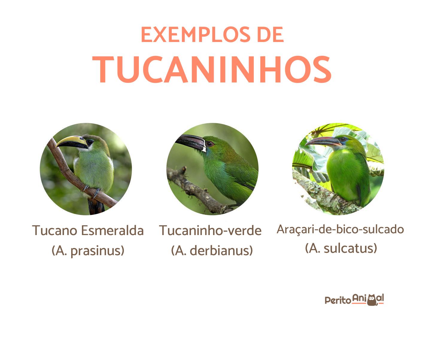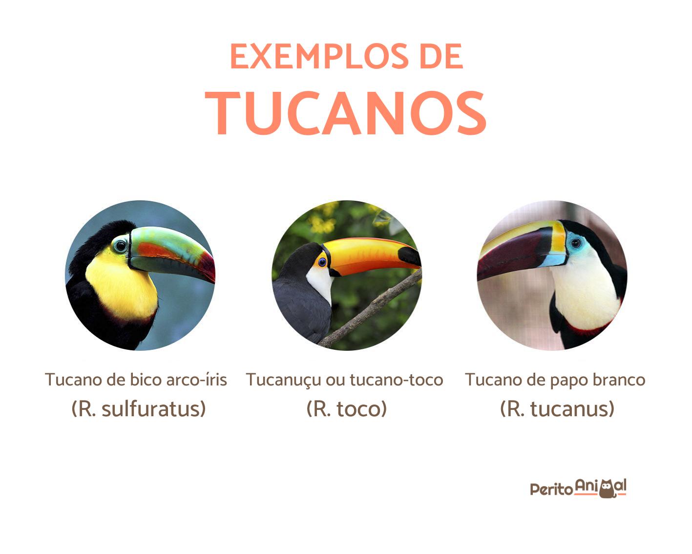 Diferentes espécies de tucanos têm variações na cor, tamanho, forma do bico e vocalizações. Aqui estão alguns exemplos: