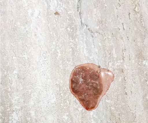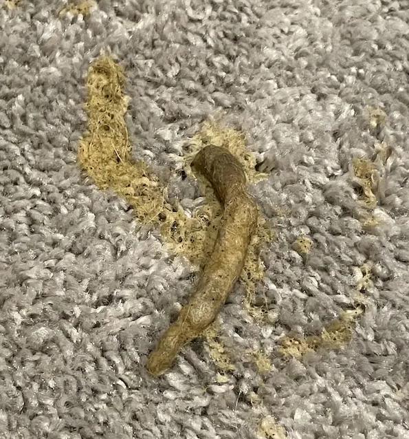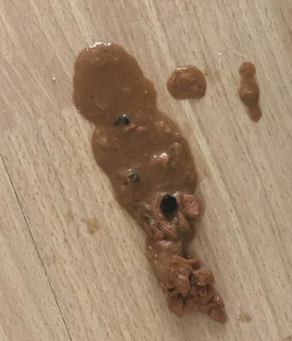 Na foto abaixo, repare o formato cilíndrico do vômito de um gato com bola de pelos.