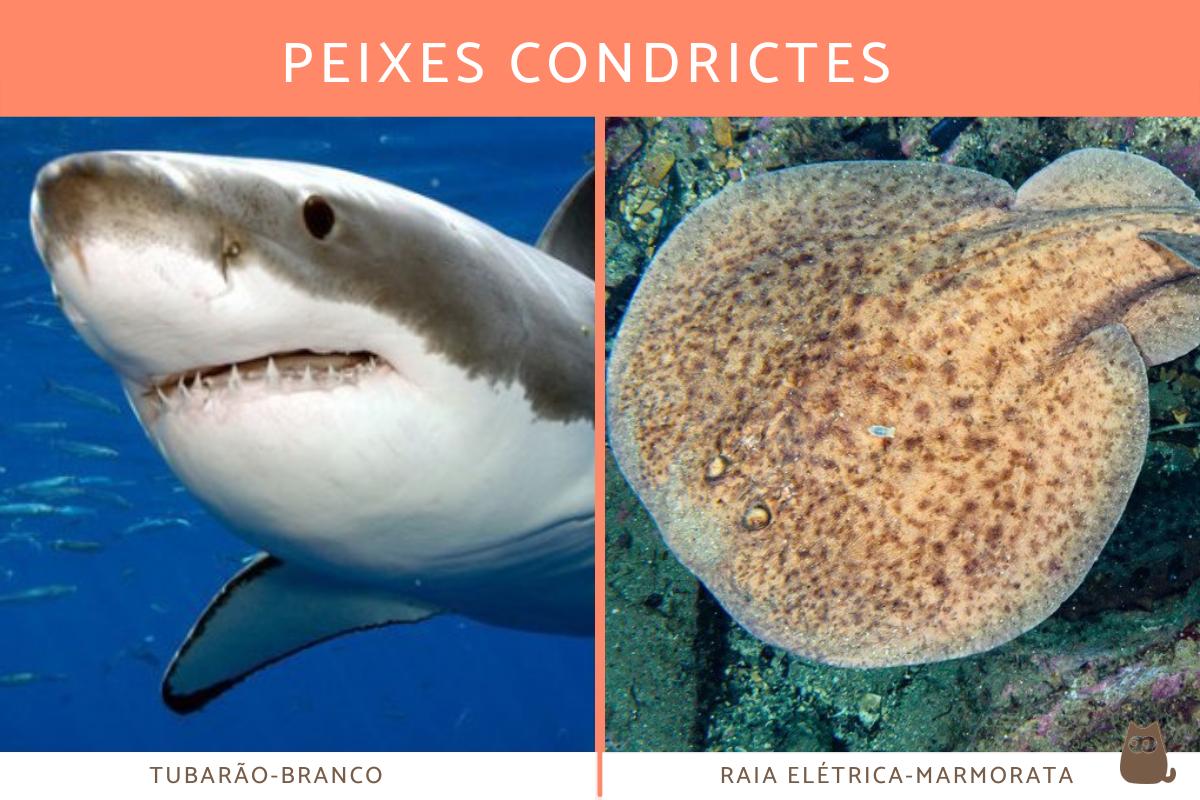 - Classe Condrictes: caracterizados por um esqueleto cartilaginoso, os dentes não são fundidos à mandíbula e estes peixes não possuem bexiga natatória. São divididos em dois grupos: os Elasmobrânquios (tubarões, raias e torpedos) e os Holocéfalos (os peixes quimeras ou tubarões fantasma, por exemplo).