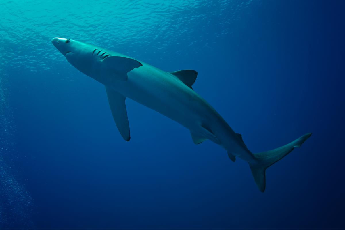 - A aleta caudal é alongada, o que lhe confere boa velocidade. A primeira nadadeira dorsal é o dobro do tamanho da segunda, enquanto as nadadeiras peitorais são incomumente longas em comparação com outras espécies de tubarões;