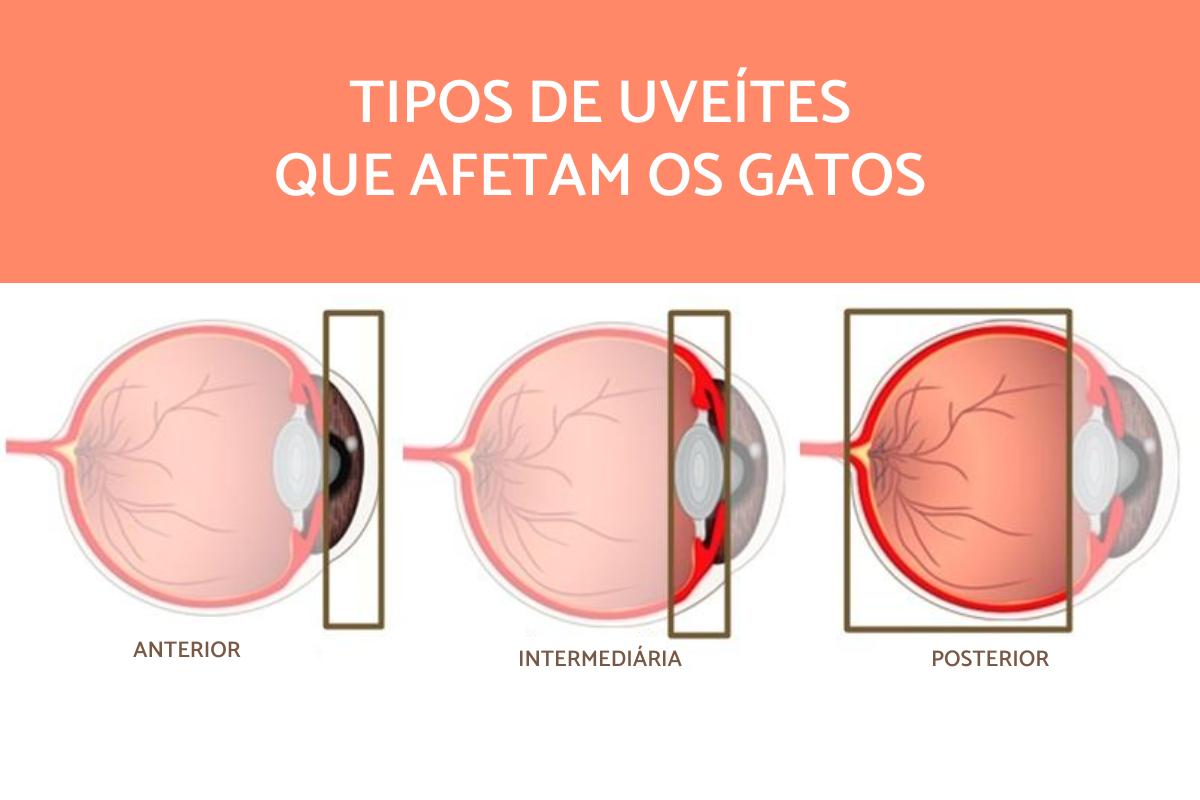 O termo "uveíte" é aplicado pela Medicina Veterinária para designar diferentes processos inflamatórios que afetam a úvea de gatos e cães. Dependendo da região ocular afetada, temos os seguintes tipos de uveíte:
