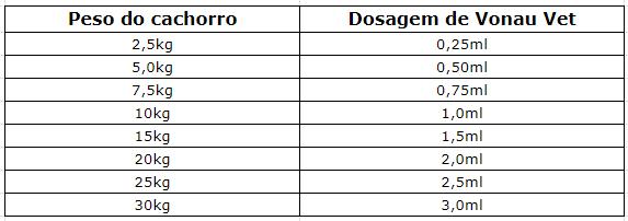 O Vonau Vet é apresentado em suspensão oral e já vem com uma seringa dosadora, o que auxilia na administração diretamente na boca do animal. Sua concentração é de 5mg por ml, sendo utilizado conforme a tabela abaixo: